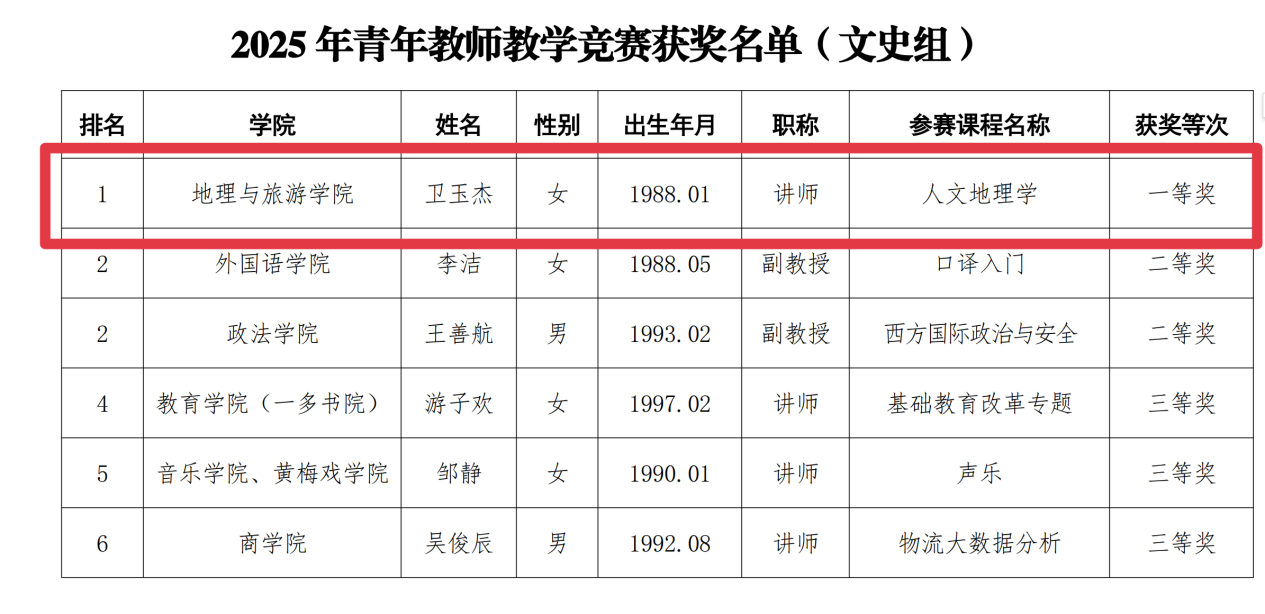 此次获奖,不仅是卫玉杰老师个人潜心钻研、刻苦磨砺的成果,更凝聚着学院长期以来对青年教师培养的高度重视与悉心栽培。一直以来,学院始终把师资队伍建设作为核心工作,为青年教师搭建成长平台、拓宽发展路径,助力青年教师快速成长为教学科研的中坚力量。这份沉甸甸的荣誉,既是鼓励,更是鞭策。未来,我院将以此次获奖为契机,进一步营造重视教学、钻研教学的浓厚氛围,激励全体教师以卫玉杰老师为榜样,深耕教学沃土,创新教学方法,不断提升教育教学质量,为培养更多高素质地理与旅游专业人才、推动学院教育事业高质量发展贡献新的更大力量!