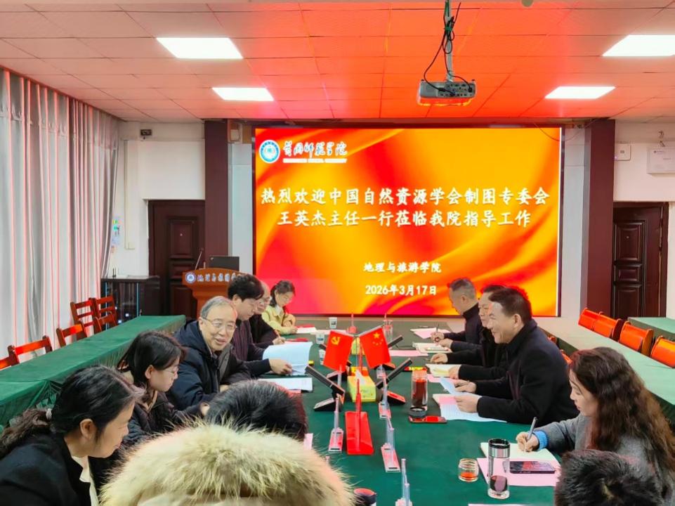2026年3月17日上午,中国自然资源学会资源制图专业委员会主任王英杰主任等一行3人来院指导学术年会交流,会议由地理与旅游学院院长刘汉成主持。出席本次交流会的嘉宾包括武汉大学资源与环境学院实验中心主任李连营教授、湖北省地图院办公室主任谭竞漪、黄冈大别山世界地质公园管理中心副主任童军、黄冈大别山地质博物馆馆长徐泉文及科普宣教科科长李凤。地理与旅游学院领导班子及相关教师代表参加会议。