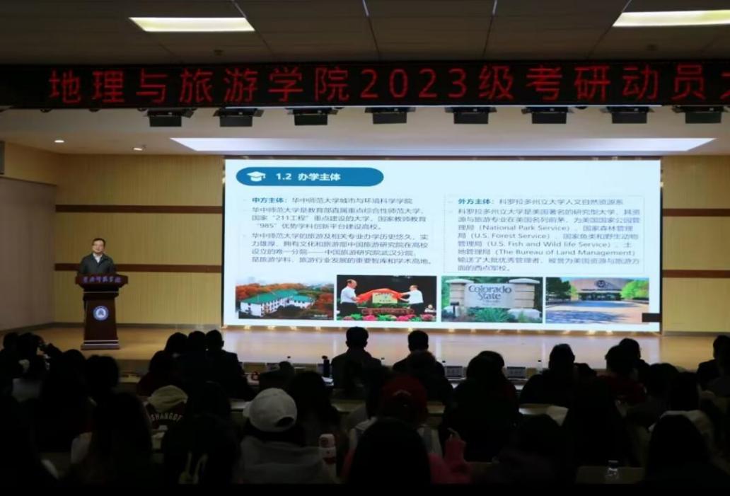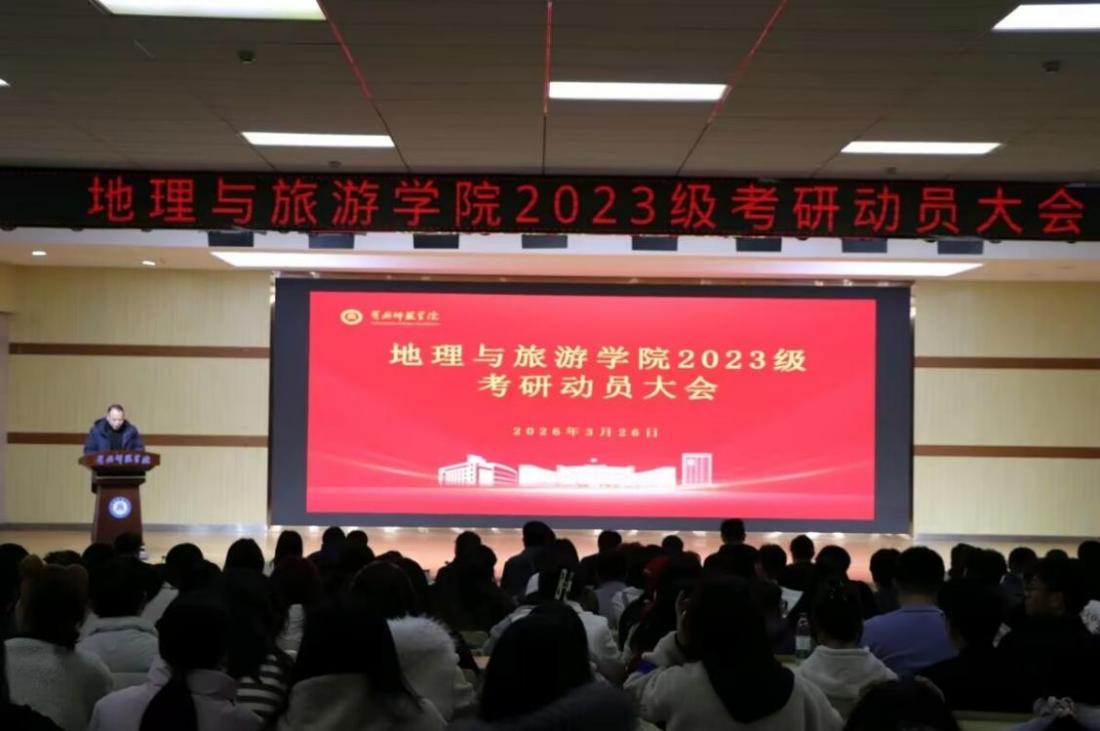为精准助力2023级学生坚定备考信念、明晰考研方向、科学备考、合理规划升学路径,2026年3月26日下午,地理与旅游学院在北区一站式学生社区大学生活动中心隆重召开2023级考研动员大会。学院党委书记杜杰、院长刘汉成、党委副书记宋明、副院长黄勇奇、副院长关江华出席会议,各专业负责人、教师代表、全体辅导员、2022级、2023级班主任老师和全体学生参会,会议由党委副书记宋明主持。